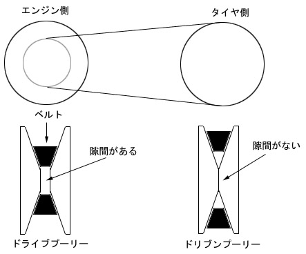 タイヤ側にもエンジン側と同じ様に2枚のプーリーがあって1枚はエンジンブロックに固定されていて、回転しか出来ません。