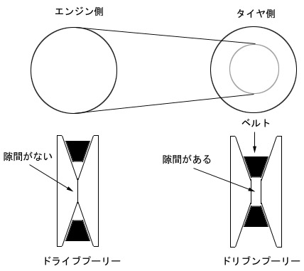 何故ベルトが割り込む程の張力を持っているか?というとそれはこの次に説明するタイヤ側のドリブンプーリー(ドリブンフェイス)がスプリングで押されて半径を大きくしている為です。