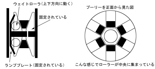 右はプーリーを正面から見た図でウェイトローラが中央に集まっています。