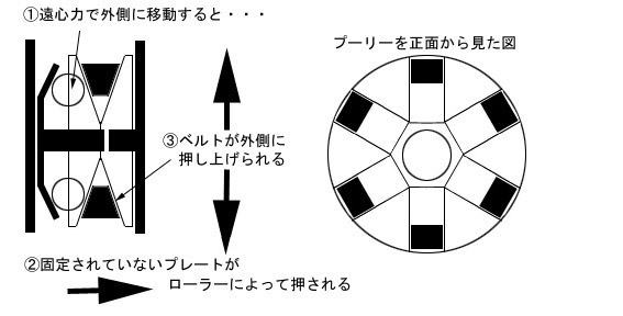 その原理は、ここでも前回のクラッチと同様に遠心力を使っています。