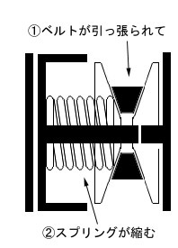 これはベルトがその張力で2枚のプーリーの間に割って入っている為で特別なスプリングが入っている訳ではありません。