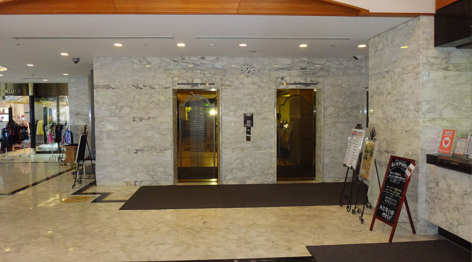 入ってすぐの左手に金色のエレベータを発見。