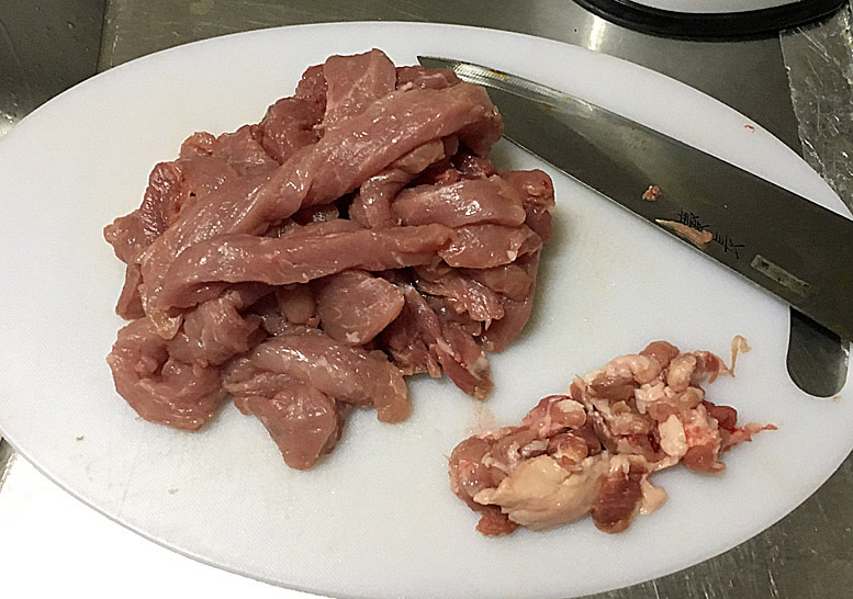 ・赤身(ヒレ/もも)の塊を購入して脂身を自ら包丁で削いでミンチにする。