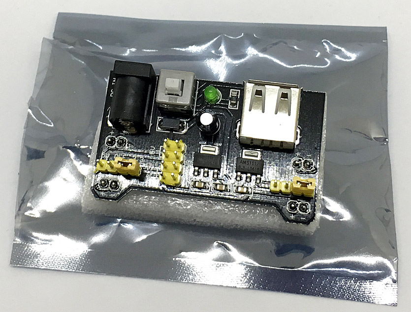 データシートが付属していないのでレビューを読んだ限りだが、DC9-12V入力で3.3Vと5.0Vをブレッドの左右にパラレルで供給できる素敵なモジュールだ。