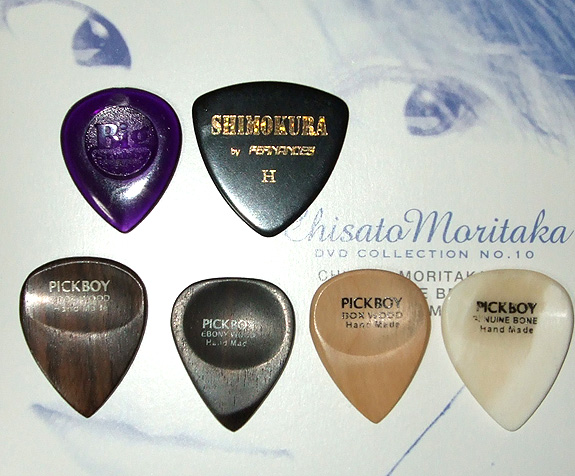 上の2つが下倉で買った一般的にあるピック。 下の4つがクロサワで見つけた、長年探し求めてしたピック。 左からローズウッド、エボニー(黒檀)、ボックス(白木)、ボーン(牛骨) ちなみに台は森高千里の「1996年横浜アリーナ・ライブ」DVD!