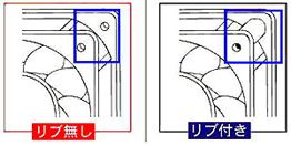 ■ リブ無し形状を採用 リブ無しタイプはリブ有りタイプに比べて、短いネジでの取り付けができ、設置可能な場所が大幅に増えました。 |
