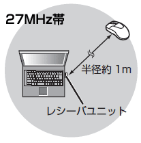 無線マウスに使われている電波には大きく分けて「27MHz帯」と「2.4GHz帯」の2種類があります。主な違いは電波到達距離です。27MHz帯は微弱電波のため電波到達距離が短く、マウスとパソコンが近接した環境でのご使用に適しています。