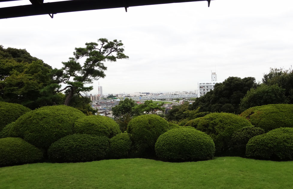 突き当りの客間より庭園を眺める。
