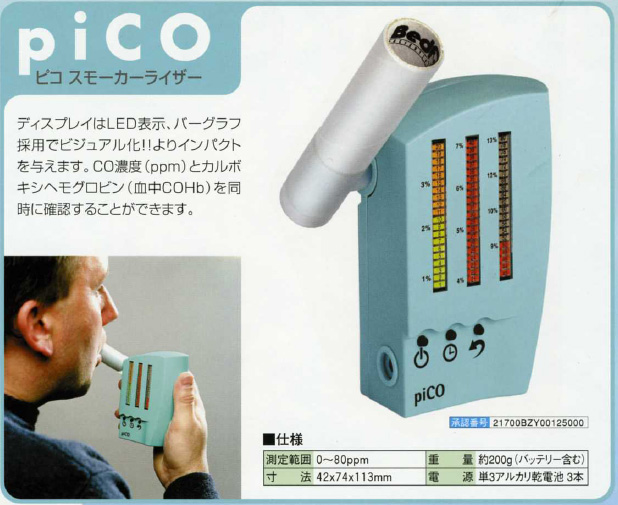 ピコスモーカーライザー(原田産業)というもので、CO濃度(PPM)とカルボキシへモグロビン(血中COHb)を同時に測定するらしい。