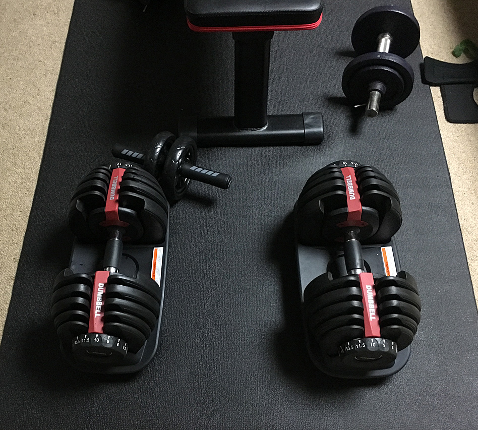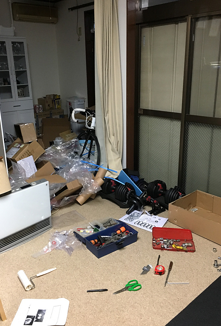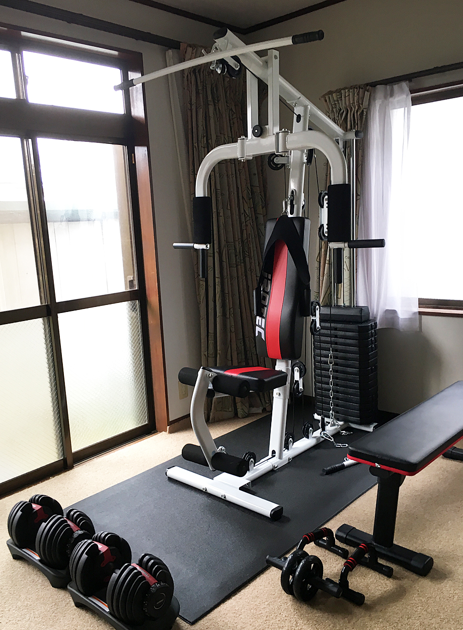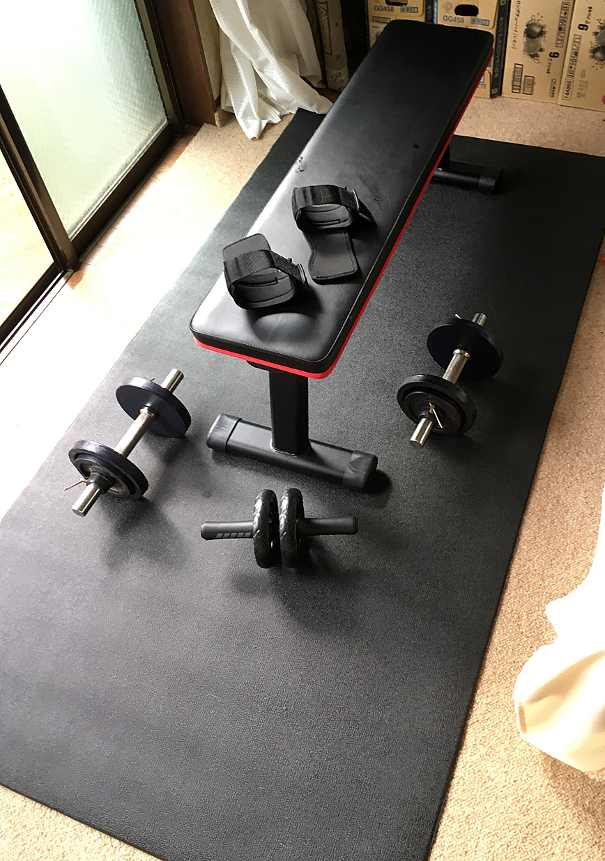 ベンチと可変ダンベルも置いて、ついにホームジムの完成だぁ〜!!