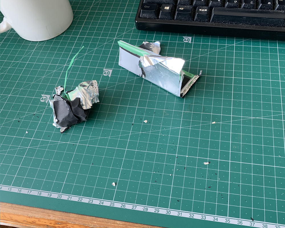 ちなみに画像左上の養生テープでグルグルに巻かれた長方形のがスマホのリチウムイオンバッテリー。 |